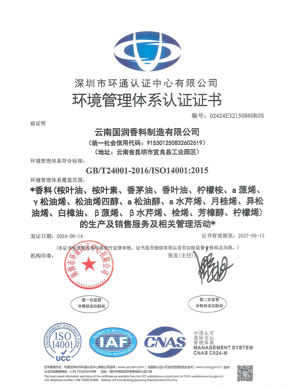 ISO14001环境管理体系认证证书